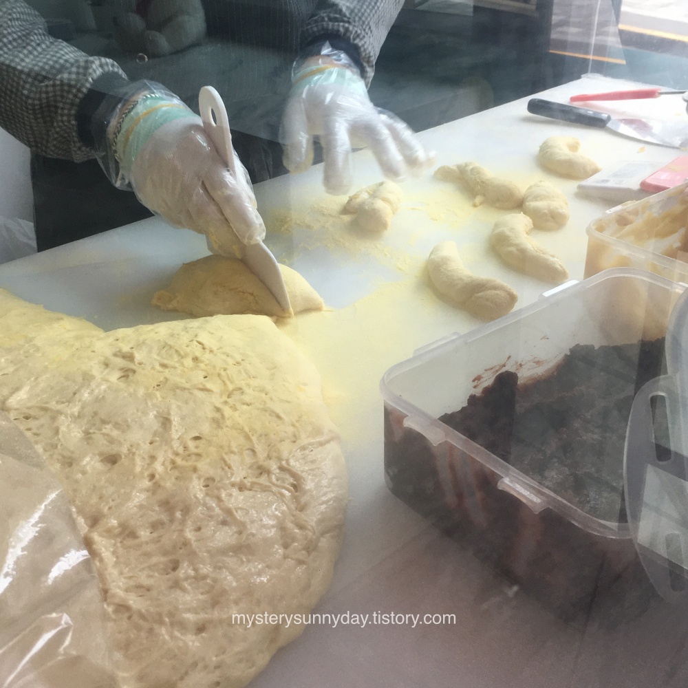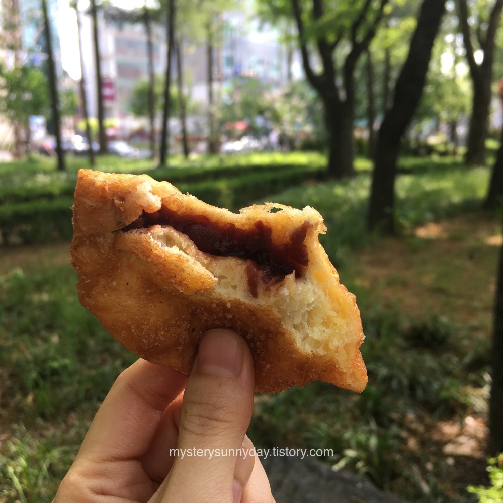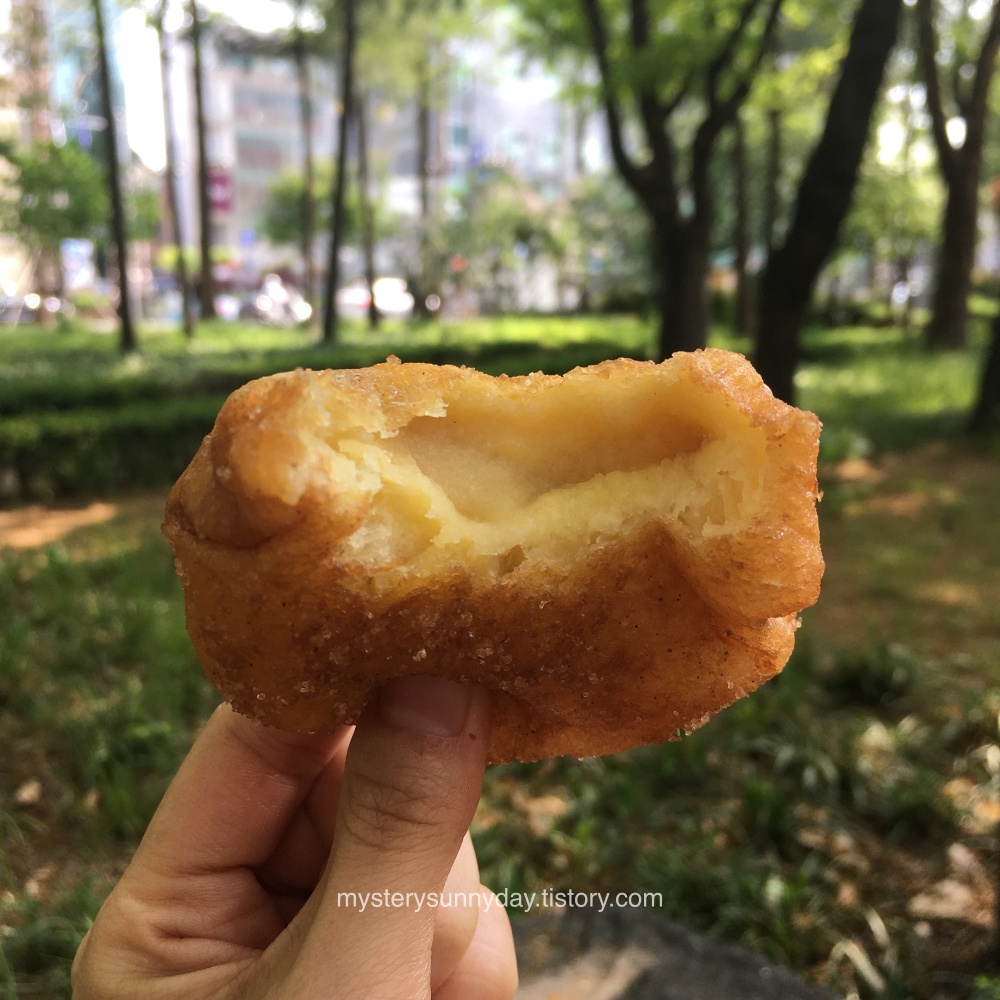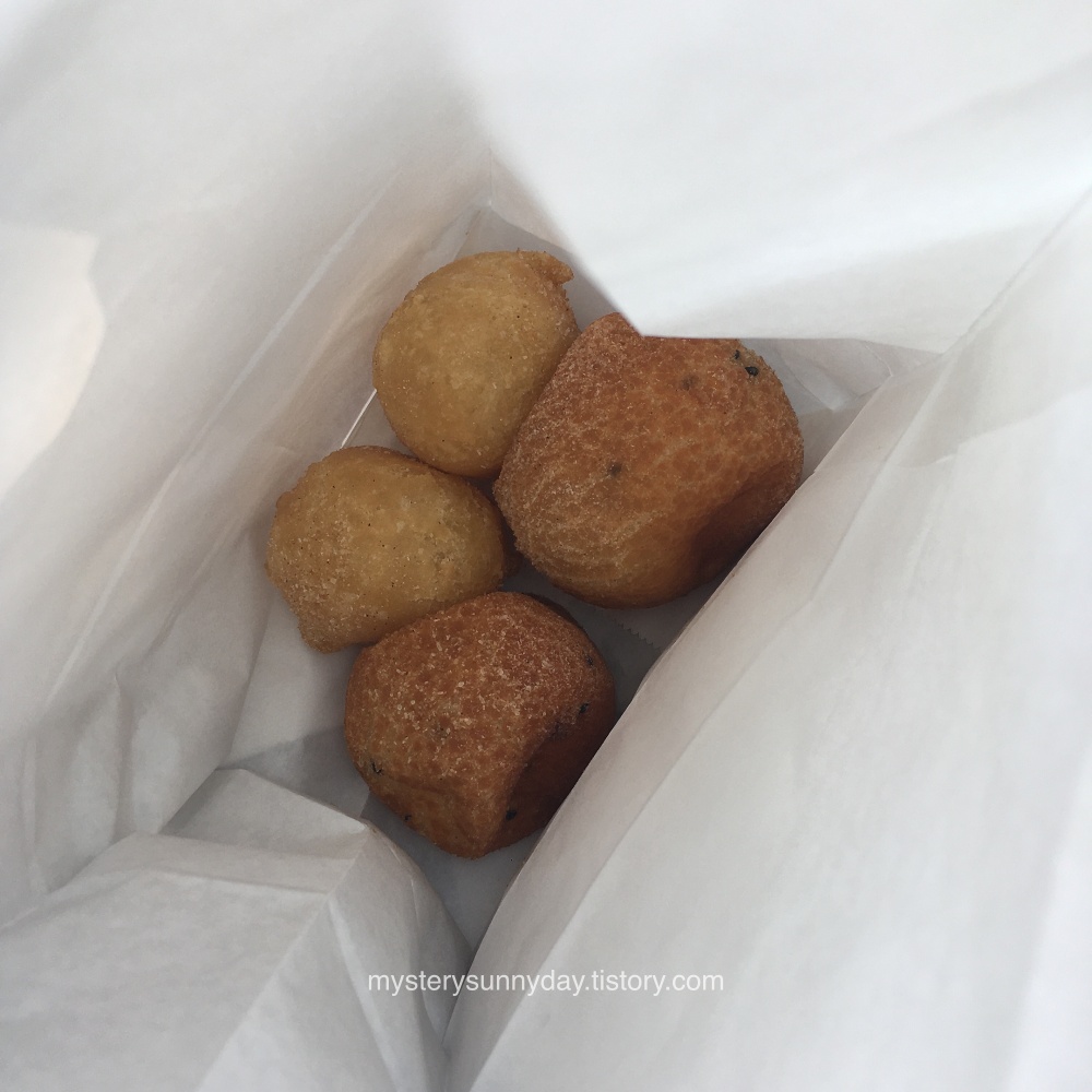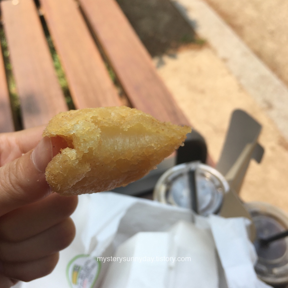 오른쪽은 깨찰도너츠인데 특이하게도 속에 완두콩 앙금이 들어있더라구요. 깨의 고소함에 완두까지 더해져서 더 고소하고 맛있었어요.