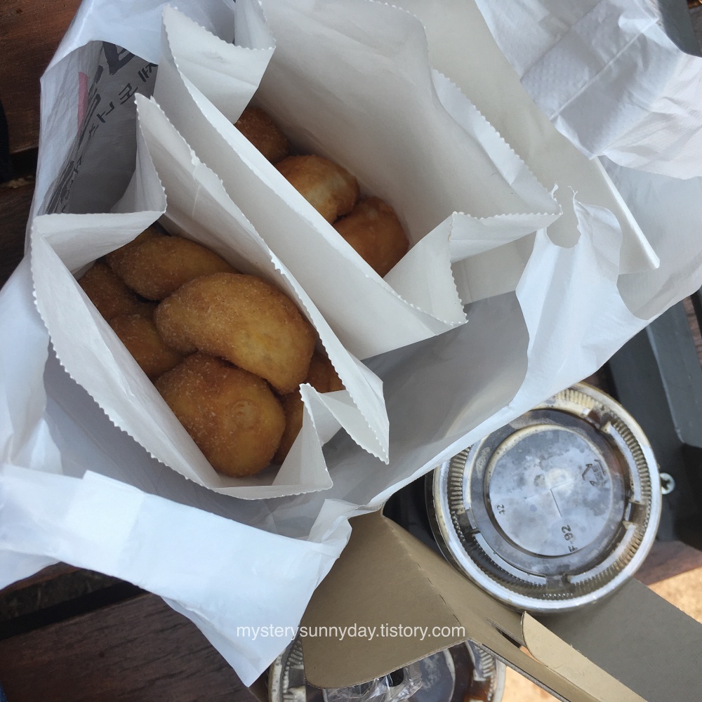 설탕가루를 묻힌 찹쌀 꽈배기와 그렇지 않은 나머지 동그란 꽈배기로 나눠서 포장해주셨어요. 사장님 포장 센스.ㅎㅎ