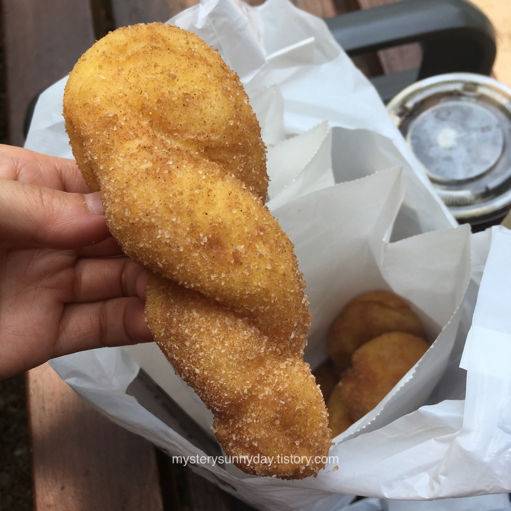 도너츠하면 빠질 수 없는 꽈배기!! 찹쌀루의 찹쌀 꽈배기입니다. 속에 아무 것도 안 들어갔는데도 왜 이렇게 맛있는 걸까요.ㅠ 즉석에서 바로 만들어주신 거라 그런지 따끈따끈하고 진짜 맛있었어요. 겉에 설탕이랑 계피가루 뿌려주신 비율도 딱 좋았구요.