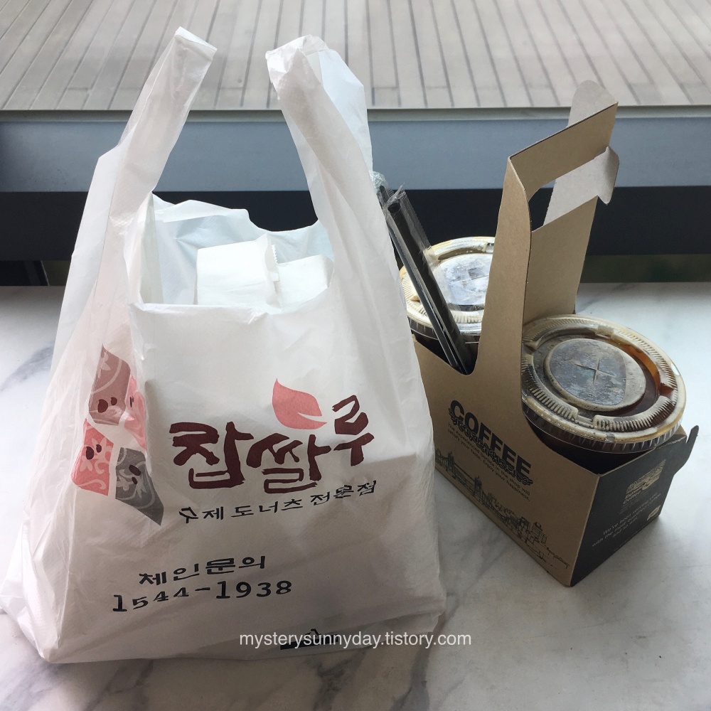 커피도 주문해서 같이 포장해서 가지고 나와 먹었어요. 포장해서 집에 가져가 먹을 경우 찹쌀 or 깨찰 도너츠는 전자레인지에 딱 5초만 데워서 먹으라고 스티커에 안내되어 있네용 :3 하지만 저는 바로 앞에 있는 호수 벤치에서 먹을 것이기 때문에 전자레인지는 패스~!